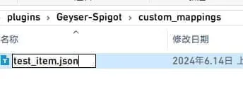 我们来到 服务端/plugins/geyser/custom_mappings 目录,创建一个 JSON 文件用于 Geyser 映射自定义物品