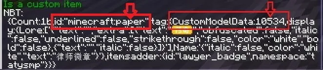 我们看到他的 IDminecraft:paper,以及 CustomModelData(简称CMD) 值是 10534